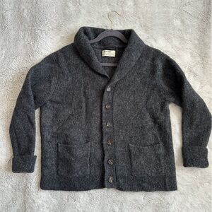 Cozy Shetland wool cardigan with button closure. Features two front pockets. Perfect for layering, very cozy and warm!