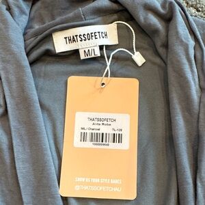 Comfortable gray wrap robe with a tie belt. Super soft. Small imperfection in the embroidered logo