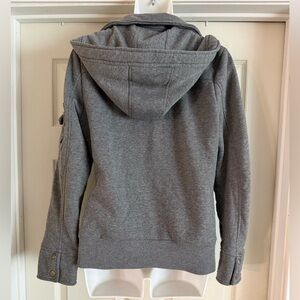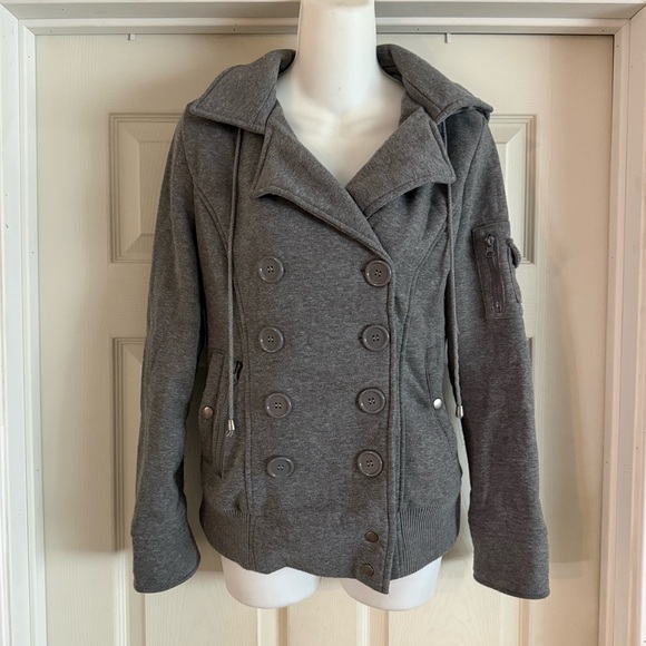• Super cute ambiance gray jacket with hoodie and drawstrings. Left arm of the jacket has a pocket on the upper part