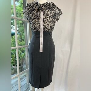 Chic midi dress with a gray skirt, fitted waist and animal print ruffled top. Perfect blend of elegance and style.