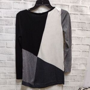 This asymmetrical blouse features a crew neck and 3/4 sleeves, with a modern graphic design.