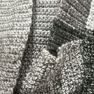 Cozy knit infinity scarf in shades of gray and black. Perfect for adding warmth and style.