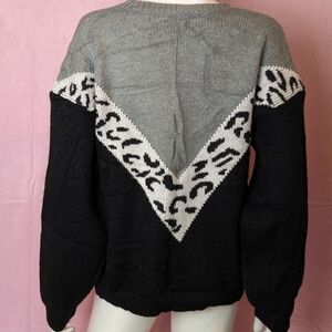 Gray and Black Leopard Chevron Stripe Crew Neck Pullover Knit Sweater Medium