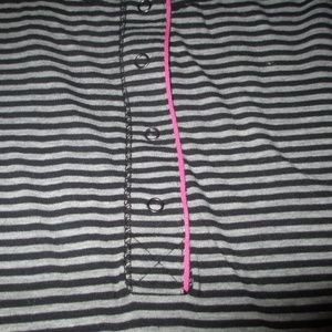 This long-sleeve shirt is extra soft, striped and has buttons that can be unsnapped. There is a pink lining going down the buttons for some color.