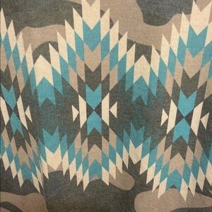 Stylish gray t-shirt with a unique blue and beige camouflage pattern. Features a geometric design across the chest.