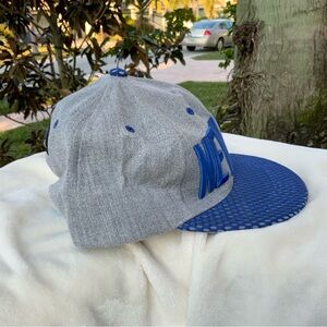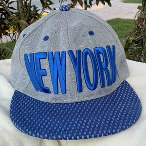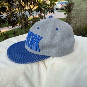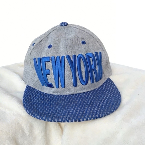 Trendy gray cap with bold blue 'New York' embroidery. Features a textured blue brim.