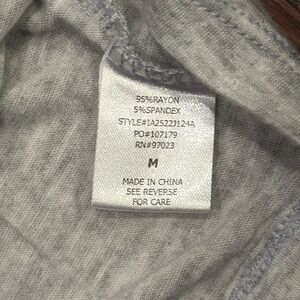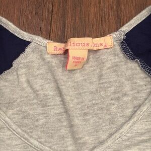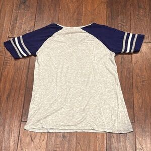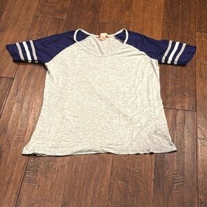 Casual gray t-shirt with blue raglan sleeves. Features sporty stripes on the sleeves.