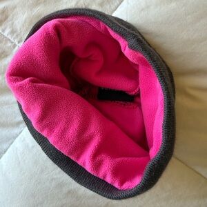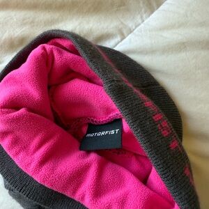 Stylish gray beanie with vibrant pink accents. Motorfist. Snowmachine / outdoors / sledding brand snowmobile