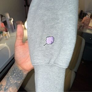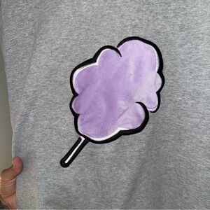 Stay cozy and stylish with this gray sweater featuring a playful purple graphic. Perfect for casual outings.