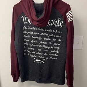 We the people hoodie. This stylish sweatshirt features a striking gray and red color combination, perfect for a sporty look. The hoodie includes a unique flag patch on the sleeve, adding a touch of flair. Ideal for casual wear, it offers comfort and versatility for any occasion. Medium. Never worn tags were removed.