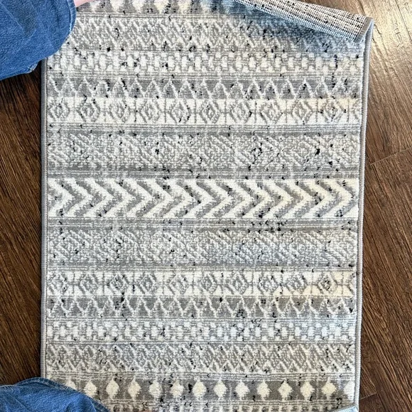 Stylish gray and white rug with intricate patterns. Perfect for any room.