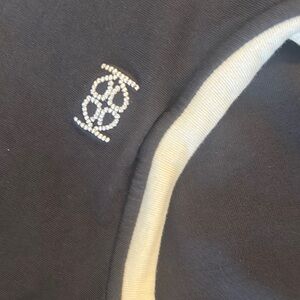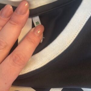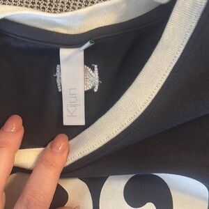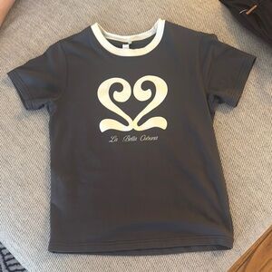 This short-sleeve tee features a dark gray body complemented by a white ribbed crew neckline. The front showcases a retro-inspired cream graphic, adding a stylish flair to this comfortable cotton-blend top. Pretty much new without tags.