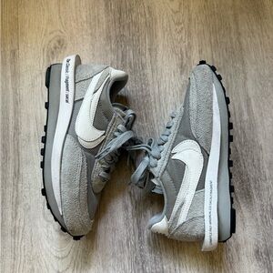 Stylish gray and white sneakers with a sleek design. Perfect for casual wear.