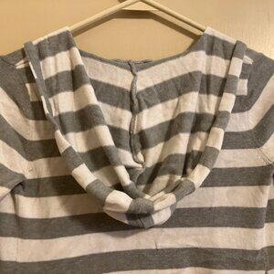 Nice Knit Hoodie. Gray and White Stripes. Open Cardigan. Belt Loops but no Belt. (Can add your own). 60% Cotton. 40% Acrylic. Measures 16-1/2" p2p, stretchy and 22" long. Nice and Comfy, Casual for Everyday Wear. Can be Women's XS/S or Girls Medium.
