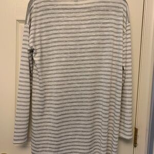 Stylish gray top with white striped sleeves. Features a V-neck design. Light weight.