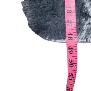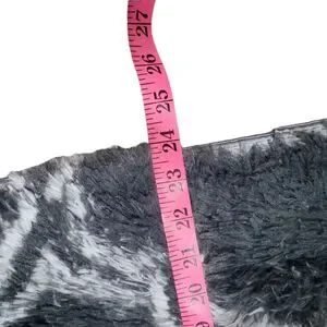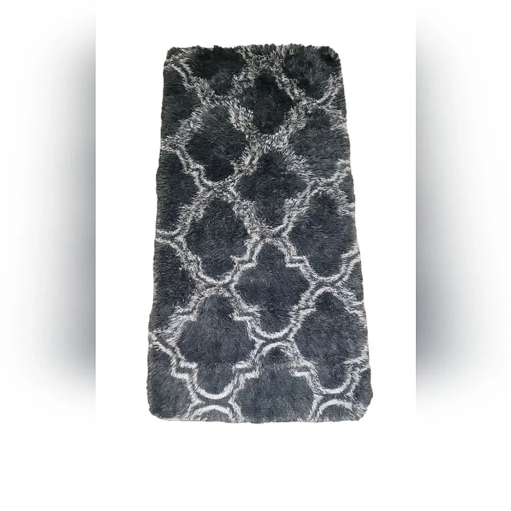 Small (measurements in photos) shaggy texture rectangle rug that is dark gray with a white trellis pattern. Very good pre-owned condition (used for a very short time in the corner of a vendor boot).