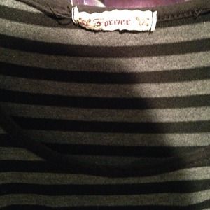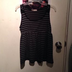 Tank top shirt, flowy at the bottom, dark gray and black stripes, cute buttons at shoulders. Sold individually as four dollars or free with any other purchase.