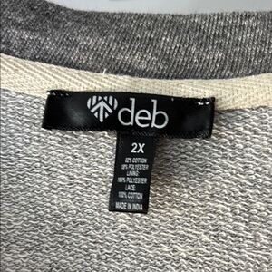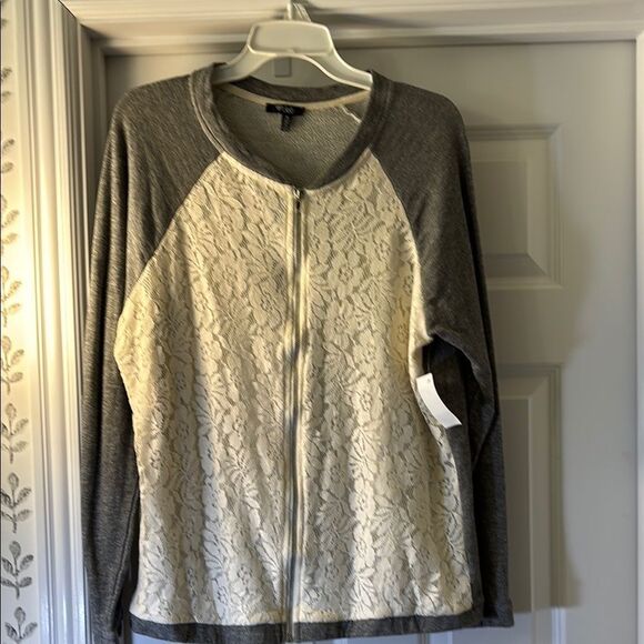Stylish zip-up jacket with gray sleeves and cream lace front. Perfect for layering. NWT & Smoke free/Pet free home. See ALL photos for complete description/details.