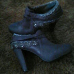 About 4 1/2 inches tall. Lace-like details with straps and a zipper.