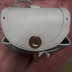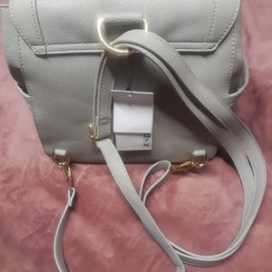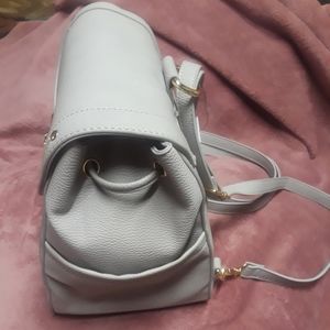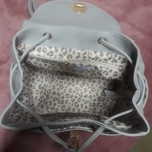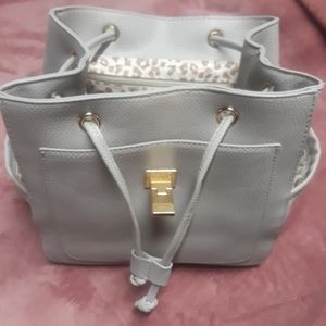 This is a gray backpack with gold detail it's a medium size bag the outside of the bag has 2 pockets on the side and has a flap that you close with a clasp and the front has a pocket on the outside the inside of the bag has 2 pockets 1 that zips and 1 that's open it also has a string that you pulls the bag closed the strap is very long and is adjustable strap unhooks to make into a crossbody backpack dimension 9.5 L × 9.5H ×6.5D and strap is 22"