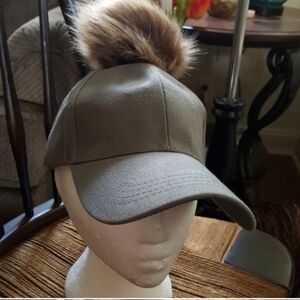 Gray baseball cap with removable fur pom pom
