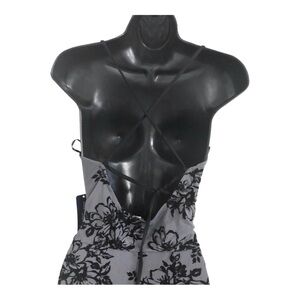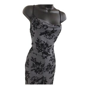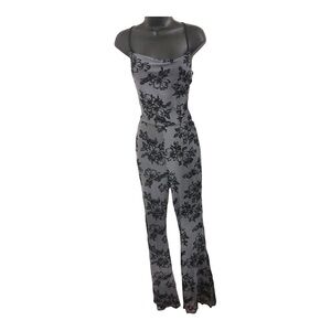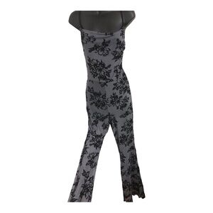 Gray & black floral applique sheer flare leg open back goth look cowlneck jumpsuit size small new
