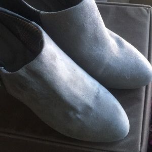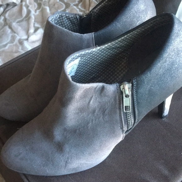 Cute gray booties with 2.5 inch heel. Zipper on outside. Wide width, but fits regular. Gray faux suede with darker gray color on back half. Never worn outside; in like-new condition!