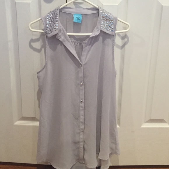 Gray sleeveless button down with silver studded collar, perfect with black leggings or dark jeans