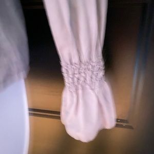 Beautiful gray, ruffled button down top with shimmery buttons and elastic at wrists