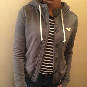 Solid grey button-down hoodie by Hollister. Very warm and cozy. Looks great layered with a vest or jean jacket.