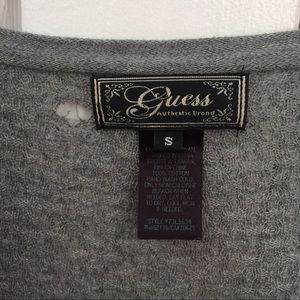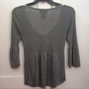 A gray top with intricate pattern on the top half and a slight peplum bottom halfit has 3/4 sleeves with a slight bell sleeve at the elbowhas a rather low scoop necklight and airy for spring and summerhas a hole near the label, but is easily covered by longer haironly 4 buttonshas been well worn but still has a lot of wear left to itgreat with a tank top underneath or just by itself