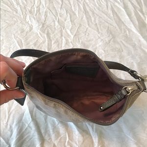 Gray in color. Good used condition. Short strap for shoulder or hand bag. Signs of use near zipper by change in color can be cleaned. 2 small signs of use seen in last picture. Probably can be cleaned