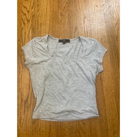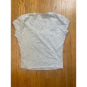 cropped gray t shirt with short cap sleeves and square neckline. 95% cotton 5% spandex PTP: 14 " Length: 16 1/2"