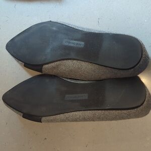 These gray flats feel like felt on the exterior with a black stretchy band across the front. Worn maybe twice? In great shape.