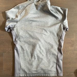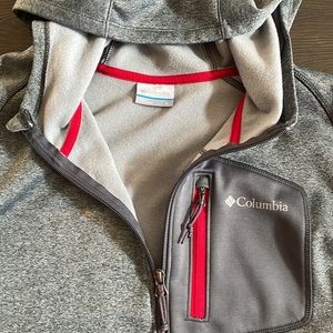 Columbia gray zip up jacket with hood. Has pockets inside on both sides. Has a touch of red on jacket.