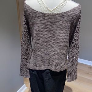 Gray knitted sweater with different pattern in back. Off the shoulder style or boat neck, depending on how u want to wear it. Long sleeves & tunic style fit. Love with black leggings, boots and black tank top underneath. All tags are removed.I’m a size small