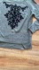 gray, knitted sweater with a black, ornate design on the front. The sweater features a crew neck, long sleeves, and a ribbed hem with side slits. The black design is centered on the chest and has a symmetrical, floral or ornamental appearance.
