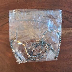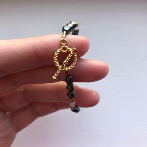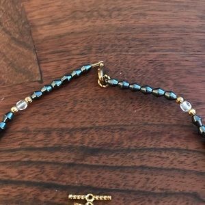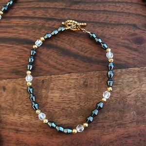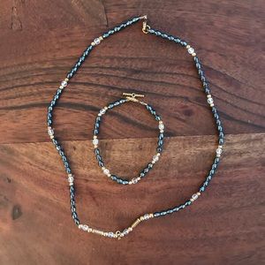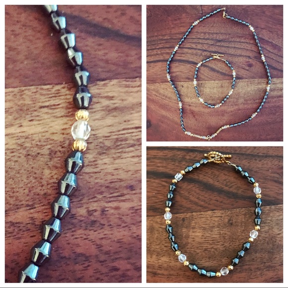Shiny dark gray metallic chrome, gold tone, and clear/transparent beaded necklace and bracelet set. The necklace has a lobster claw clasp, and measures 18 inches. The bracelet has a toggle enclosure, and measures 7.5 inches. These pieces of jewelry have never been worn, and still come in their original packaging. An edgy jewelry set, and a great dark neutral to bring to any light-colored clothing!