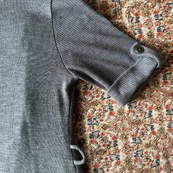 Gray open front cardigan with belt loops to put your own fashion belt with.