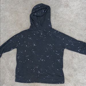 From the forever 21 athletic collection, the material is very nice, and would be a great workout hoodie, or would be perfect to just lounge around in. Only worn once, it has no stains or tears and is basically new. has a paint splatter pattern all over the outside. Runs true to size.