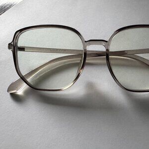 Rectangular gray frames. Korean brand, bought it in Asia. Super lightweight and comfy. I got lots of compliments on this frame. With prescription