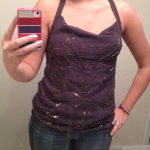 Gray Express top with different sequins and beading detail on front. Single twist strap design on back. Never worn
