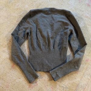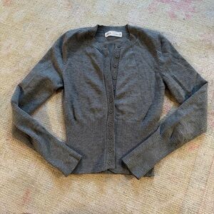 Stylish gray ribbed cardigan with button-up front. Perfect for layering.