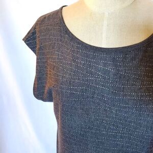 Gray Foreign Exchange Tunic Top with a pretty neck line, loop and tie on the back... Nice, interesting design with gold dot line pattern... Excellent condition and nice soft fabric. Size S - 18" across bust.