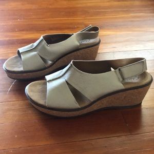 These pewter wedge sandals by Clark’s have a cute cork bottom and leather upper.