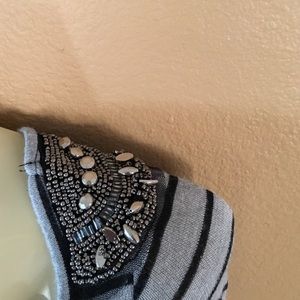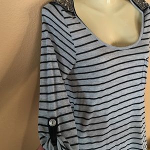 Cute 3/4 quarter sleeve stripped top. Beaded on shoulders and button detail on sleeves.