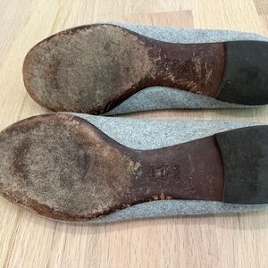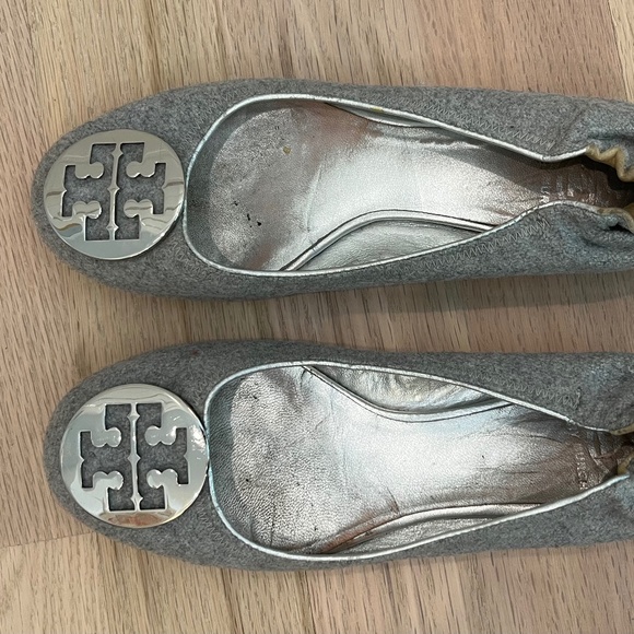 Gray wool classic Tori Burch ballet flats with the signature metal logo on the toe and silver cord around the top. Elasticized back. These have been well worn but still have plenty of life in them. Could fit 8.5 - 9.
