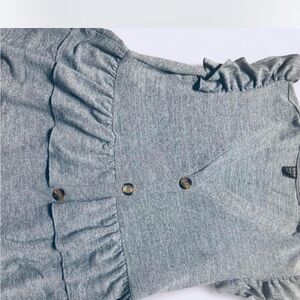 Stylish blueish gray top with ruffled sleeves and button-down front. Perfect for casual wear.