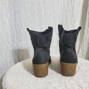 Gray faux suede pull on booties with tan color heel and sole. It has 2" heels. Pre-owned in good condition. Please refer to pictures for best description and condition verification.