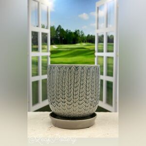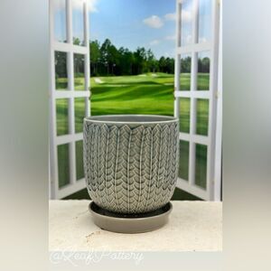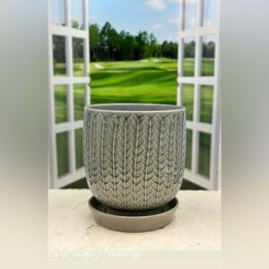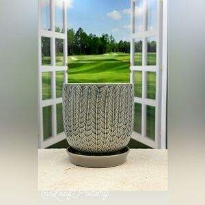 Dimensions: 7.5”H x 7”W, Opening 6.25”, weight 3lbs 5.7oz, Material: Ceramic, Drainage hole, Made in China, saucer attached to the planter , Color: Glossy Gray , Perfect for Indoor/Outdoor gardening, Don’t forget to dress up your plants 🪴